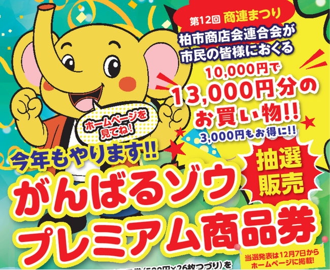 【千葉県柏市】柏市商店会連合会「がんばるゾウプレミアム商品券」の申込スタート!