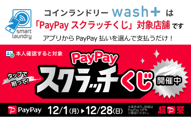 コインランドリーwash+が「PayPayスクラッチくじ」対象店舗として超PayPay祭に参加