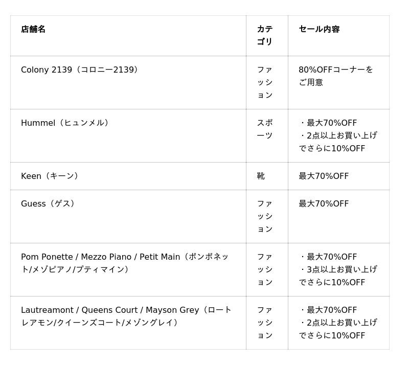 「Happy Summer Days」では、夏物ファッションや機能性アウトドアグッズ、暑さ対策グッズやキッチン雑貨など、夏のお出かけやアクティビティ、のんびりと過ごす時間に活躍する多彩なアイテムをお得な価格でご用意します。また、7月19日(土)~21日(月・祝)の3日間は、人気ブランド「As Know As(アズ ノゥ アズ)」による屋外催事販売も開催。施設内の常設店舗では取り扱いがない催事限定アイテム、着用には問題ないほつれや小さいキズがついてしまったB級品など、最大80%OFFのお得な価格で販売します。