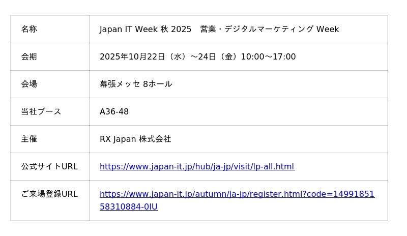 IT・DX総合展「Japan IT Week 秋 2025」を構成する4つの展示会のうち、当社が出展する「営業・デジタルマーケティング Week」は、デジタルの力で営業・マーケティングを進化させる総合展です。急速に変化する消費者行動や市場環境の中で、成果を最大化するための製品・サービスを有する企業が一堂に集結します。