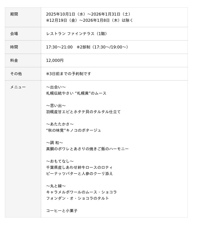 舞浜ビューホテル by HULIC(所在地:千葉県浦安市、総支配人:鈴木裕樹、運営:ヒューリックホテルマネジメント株式会社)は、2025年10月1日よりホテルリブランドを記念した「ディナーコース つむぐ」を2026年1月31日(土)までの期間限定で販売しております。