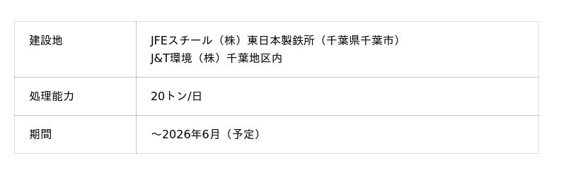 本設備は、2024年2月にNEDOグリーンイノベーション基金事業「廃棄物・資源循環分野におけるカーボンニュートラル実現」に採択された、「ガス化改質と微生物を用いたエタノール製造による廃棄物ケミカルリサイクル技術の開発」[※1]のために、JFEスチール株式会社東日本製鉄所(千葉県千葉市)の敷地内に立地するJ&T環境千葉リサイクルセンター内に建設されたものです。