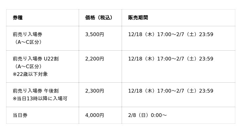 事前抽選および会場物販にて販売を予定しており、事前抽選は12/24(水)から申込み受付を開始します。