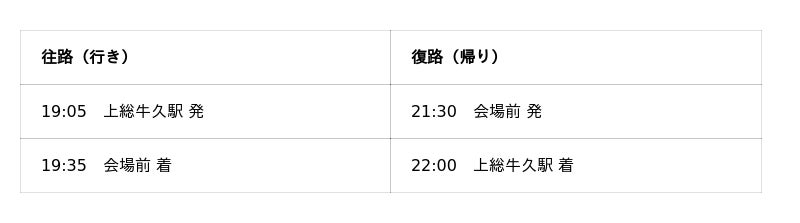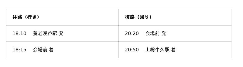 土日祝日限定でシャトルバスを運行いたします。発着は、小湊鐵道「養老渓谷駅」および「上総牛久駅」と会場間となります。■ 運行概要