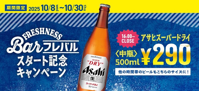 \「フレバル」スタート記念キャンペーン/16時~アサヒスーパードライ〈中瓶500ml〉が290円!通常の単品・セットビールも〈中瓶〉で満足度アップ!