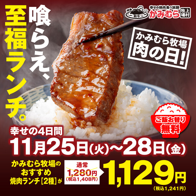 【かみむら牧場】毎月恒例の「肉の日」企画。11月25日から11月28日の4日間で、かみむら牧場おすすめ焼肉ランチ(2種)を1129(いい肉)円で販売!ご飯お替り無料も!