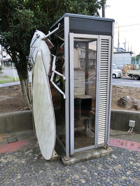 茂原市八千代のNTT東日本茂原ビル脇に見つけた電話ボックスは、後者の力を持つアートに分類できるだろう。外側にしがみつく巨大なセミのオブジェ。受け手が感じ取るべきは、昆虫の生態への興味か、はたまた、ホラーは日常の裏側にこそ潜みうる、というある種の真理か―。