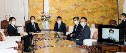 会談に臨む自民、公明、国民民主3党の幹事長ら=19日午後、国会