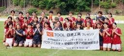 チャリティーマッチを終え、記念撮影する欧州で活躍する女子サッカー選手と早稲田大ア式蹴球部女子の選手=19日、宮城県女川町