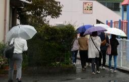 川崎幼稚園が開いた説明会に向かう保護者ら=7日午前、静岡県牧之原市