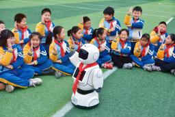 小学校の授業でロボットとゲームをする子どもたち=10日、中国江蘇省南通市(共同)
