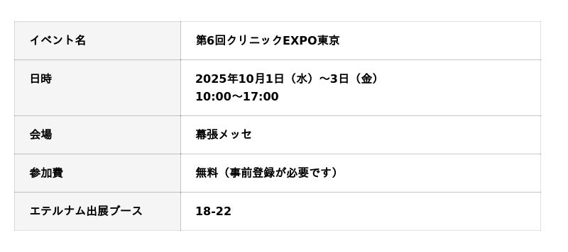 『永遠の美しさへの夢が、 夢に終わらない未来を創りあげること』を使命に掲げる、化粧品の研究開発・製造販売を行う株式会社エテルナム(本社:東京都渋谷区、代表取締役:松本隆明)は、2025年10月1日(水)~3日(金)幕張メッセにて開催されるクリニック向け専門展示会「第6回クリニックEXPO東京」(RX Japan株式会社主催)に出展します。 本展示会では、当社の医療機関専売品である「エテルナムDR」をはじめヒト臍帯由来間葉系幹細胞培養上清液を高配合したスキンケア製品「エテルナム」シリーズ、話題の”唇育”リップセラムを展示・販売いたします。
