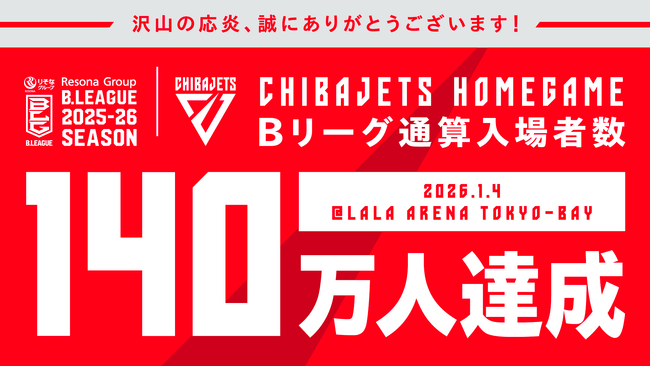 【千葉ジェッツ】Bリーグ最速でホームゲーム通算入場者数140万人達成!平均入場者数1万人も維持し続け、今後も地域から愛されるクラブを目指して邁進!!