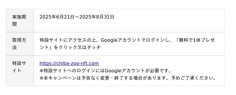 今回は、特設サイトの公開記念として、より多くの方にNFTや千葉市動物公園の魅力を知っていただくことを目的に、誰でも無料で3D・NFTを1体取得できるキャンペーンを実施いたします。