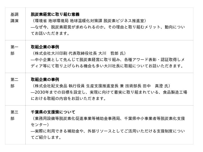 株式会社ちばぎん総合研究所(取締役社長:前田栄治)は、千葉県主催「ちば脱炭素セミナー~ゼロからはじめる脱炭素経営~」の運営を受託し、県内事業者の脱炭素化に向けた取組を支援します。