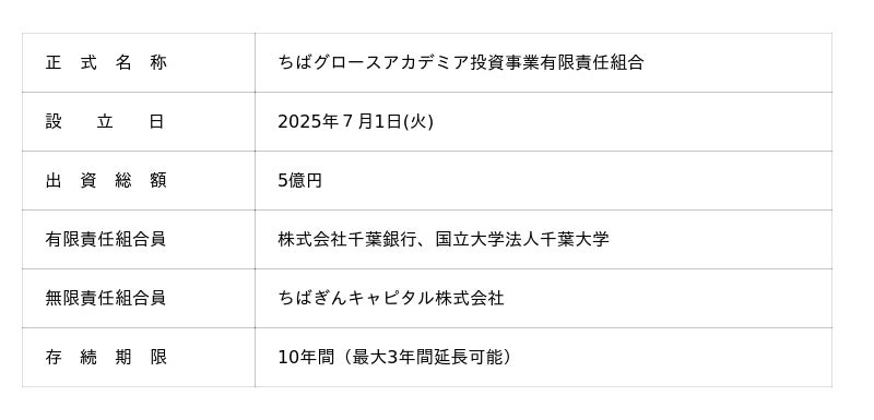 国立大学法人千葉大学(学長 横手 幸太郎、以下千葉大学)は2025年7月1日(火)に、株式会社千葉銀行(頭取 米本 努、以下千葉銀行)およびちばぎんキャピタル株式会社(取締役社長 松本 啓希)と共同で「ちばグロースアカデミア投資事業有限責任組合(略称:ちばグロースアカデミアファンド)」を設立しました。