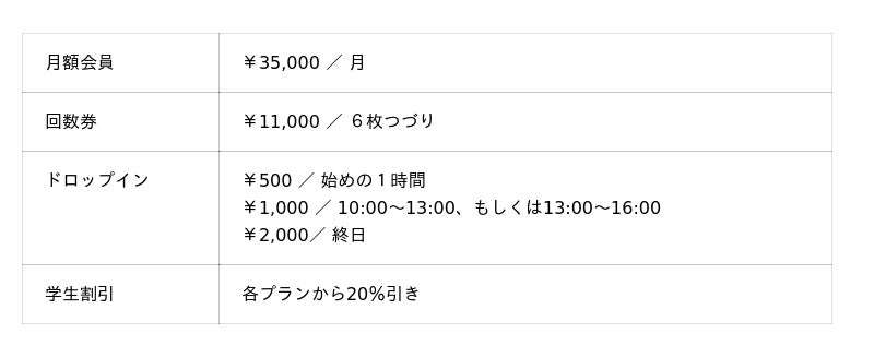 サービス:コワーキングスペース、光回線(Wi-Fi)、フリードリンク(ティーバッグ、ドリップコーヒー、ソフトドリンク)、充電ケーブル、延長コード、文房具、冷蔵庫、電子レンジ、キッチン