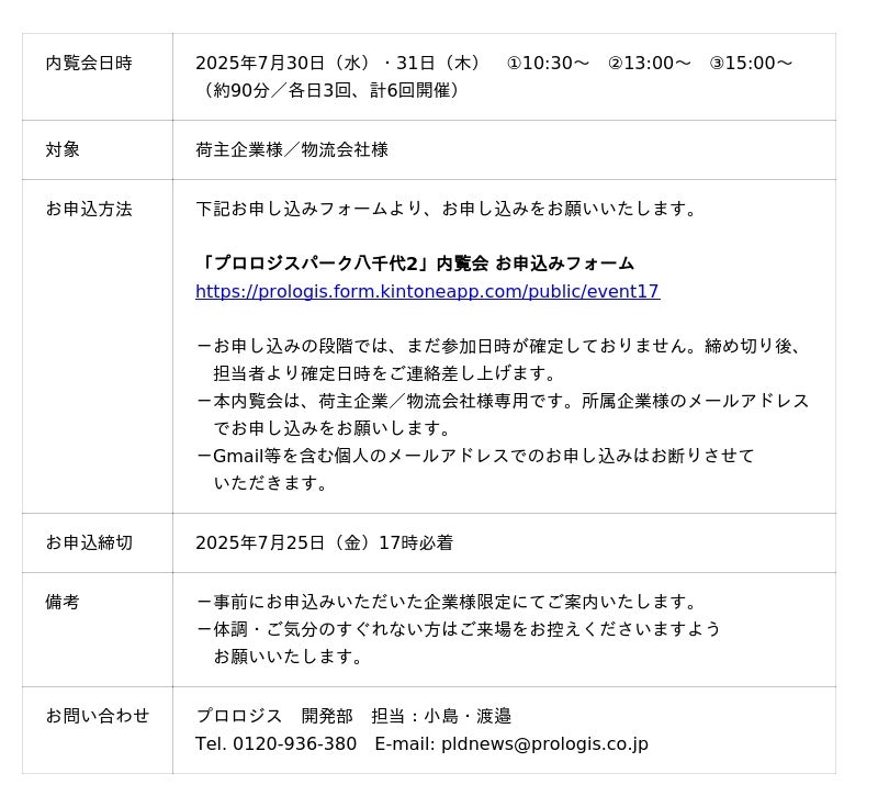 プロロジスは、2025年7月30日(水)~31日(木)の2日間、「プロロジスパーク八千代2」の内覧会を開催します。