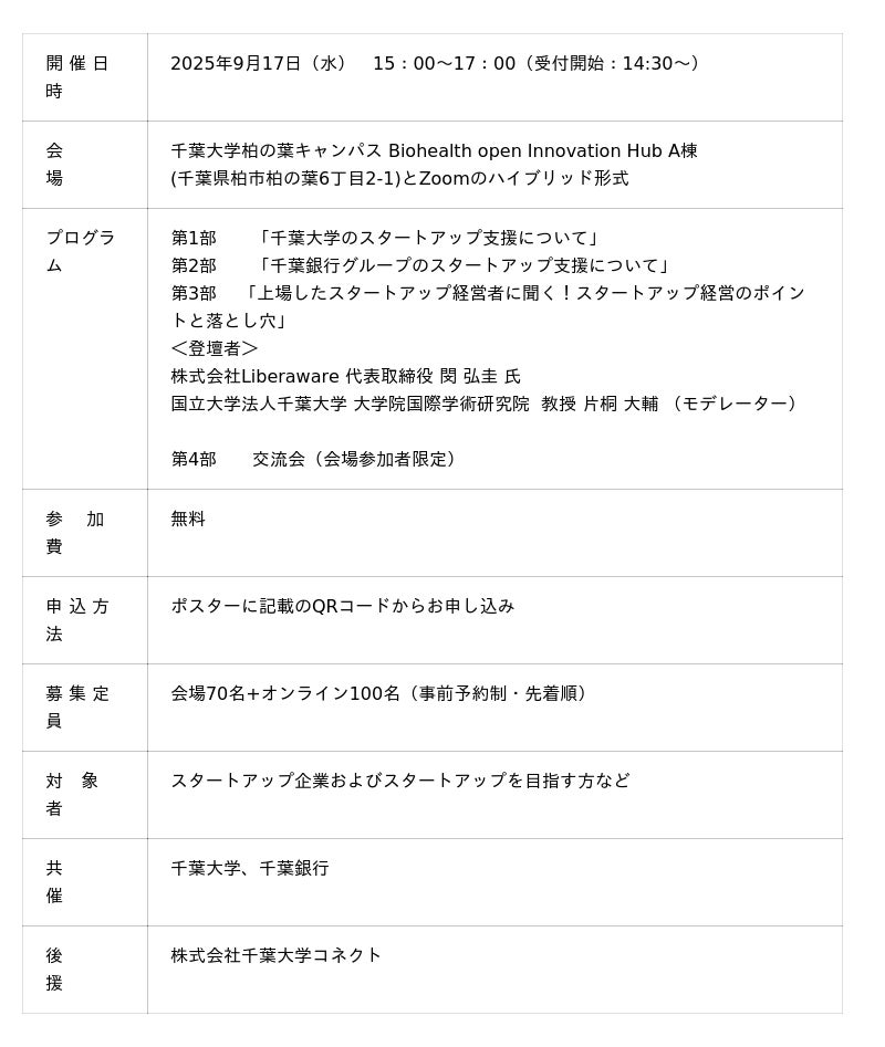 国立大学法人千葉大学(学長 横手 幸太郎、以下千葉大学)は株式会社千葉銀行(頭取 米本 努、以下千葉銀行)と共に2025年9月17日(水)に、地域のスタートアップを対象とした「スタートアップセミナーCHIBA 2025」を開催します。本セミナーは「ちばグロースアカデミアファンド」の設立を記念し開催されます。