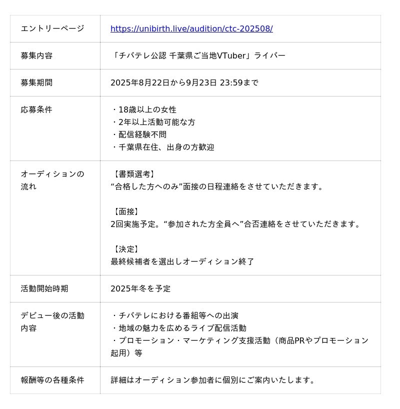 静岡新聞社・静岡放送公認VTuber「木乃華サクヤ(このはなさくや)」や、MRT宮崎放送公認VTuber「日向海フェニカ(ひなみふぇにか)」などを手掛けるBtoB VTuber専門プロダクションのユニバースプロダクション株式会社(代表取締役社長:浦田英博)は、千葉テレビ放送株式会社(代表取締役社長:青柳洋治)との「チバテレ公認VTuber」事業における業務提携、及び当該VTuberのライバーオーディションの開催を発表いたします。