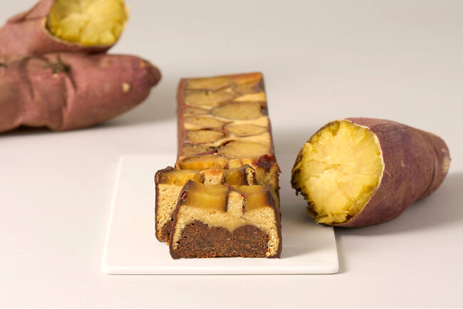 上部には、「金蜜芋」の焼き芋を皮ごと混ぜ込んださつまいも生地を使用し、さらに焼き芋のスライスをそのままトッピング。下部のガトーショコラ生地にも焼き芋を加えることで、芋本来の豊かな香りと濃厚な甘みを楽しめるよう仕立てました。隠し味として、醤油を生地全体に加えることで、奥行きのある旨みをプラスしています。