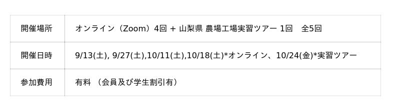 - 会場:オンライン(Zoom)+実習ツアー(山梨県)