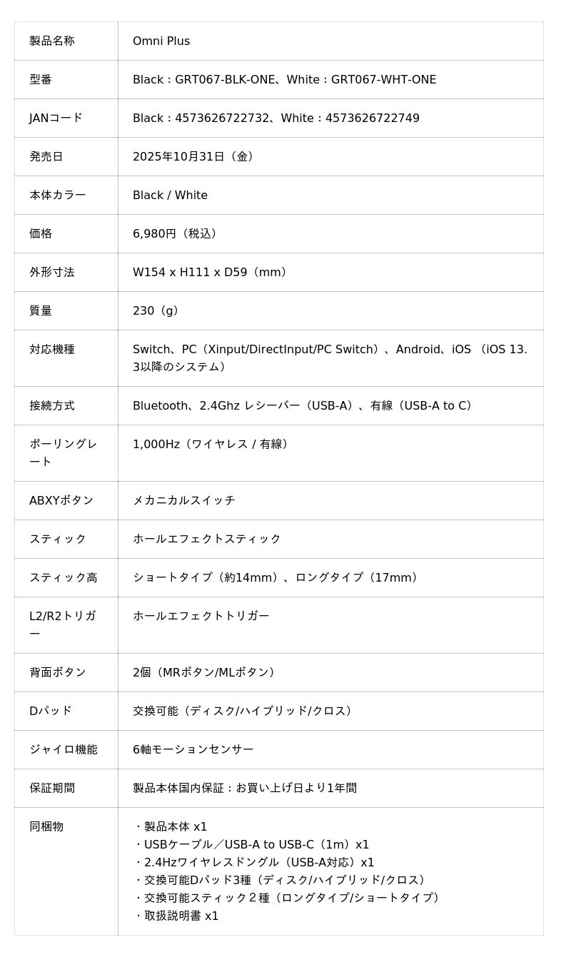 この度、毎日の当たり前をアップデートする『GRAPHT STANDARD』シリーズより、スティック・十字キーの交換、背面ボタンの割り当てによるクイックカスタム可能なゲームパッド『Omni Plus(読み:オムニ プラス、Black / White)』をGRAPHT公式ECサイト『GRAPHT OFFICIAL STORE』(以下 ECサイト)や全国の家電量販店等にて2025年10月31日(金)に発売します。