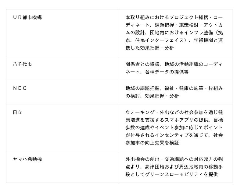 今後、UR都市機構、八千代市、NEC、日立、ヤマハ発動機は、各種実証を通じてUR賃貸住宅団地を中心とした「健康なまちづくり」を進めていきます。各社の専門技術を生かした多様なサービスの提供を契機に、少子高齢化や地域のつながりの希薄化といった社会課題に取り組み、多世代が安心して暮らせる新たなコミュニティの形成に向け連携していきます。