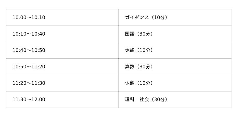 算数・国語 (各30分)、理科・社会(合わせて30分)