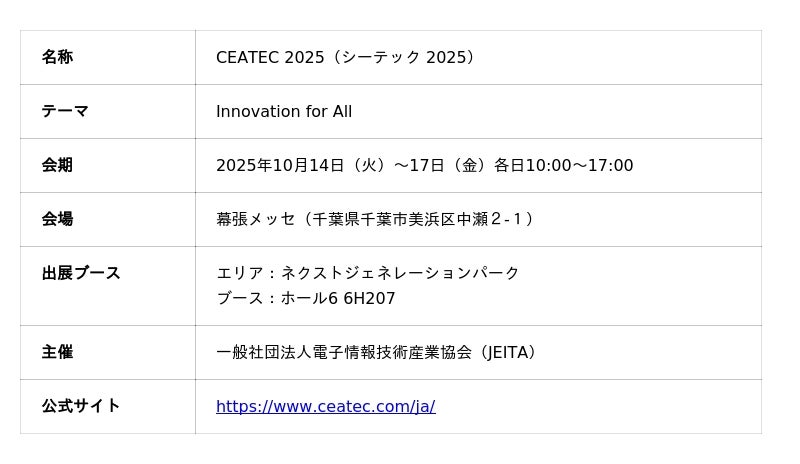 株式会社Qualiteg(本社:東京都千代田区、代表取締役:三澤智則)は、2025年10月14日(火)から17日(金)まで幕張メッセで開催される国内最大級の総合展示会「CEATEC 2025」に出展いたします。