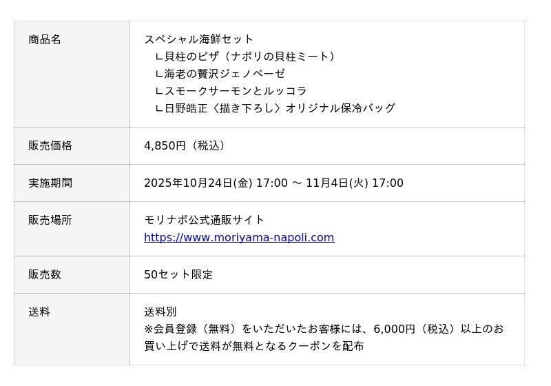 冷凍ピザ等の製造・販売を手掛けるブランド「モリナポ」(株式会社森山ナポリ/石川県金沢市)は、海の幸をふんだんに使用した3種類のピザにオリジナル保冷バッグが一緒になった「スペシャル海鮮セット」を、2025年10月24日(金)より、公式通販サイトにて数量限定で販売いたします。