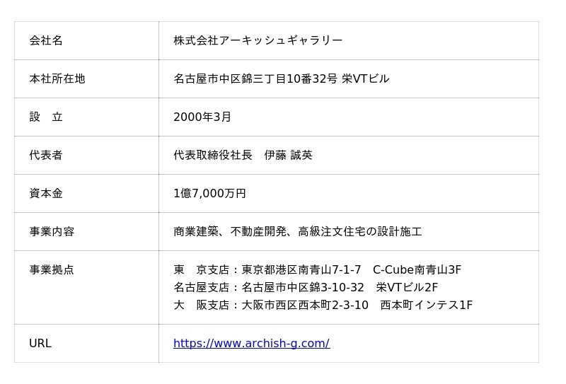 当社子会社であるアーキッシュギャラリーは東京・名古屋・大阪を中心に、商業建築・不動産開発・高級注文住宅の企画・設計・施工を行う総合建設会社です。鉄筋コンクリート造・重量鉄骨造を得意とし、国内外の自動車ショールームやマンション、オフィス・テナントビルを中心に、多彩な建築を設計施工一貫体制で行っています。また、社内設計部である「Agg.一級建築士事務所(URL:https://www.agg.archish-g.com/)」は設計事務所としても活動しており、多彩な商業建築を中心に日本全国の案件に対応しています。