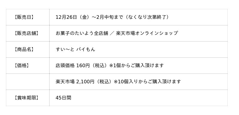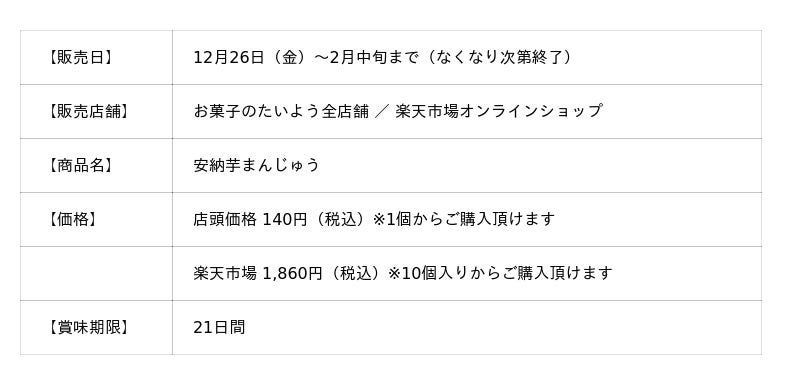 株式会社太陽社(所在地:千葉県匝瑳市飯倉293、代表取締役:片岡正裕)が展開する、千葉県で長年愛され続ける菓子店「お菓子のたいよう」は、千葉の芋文化と菓子づくりの技を結集した人気商品を、12月26日(金)より全国へ向けてオンライン販売いたします。