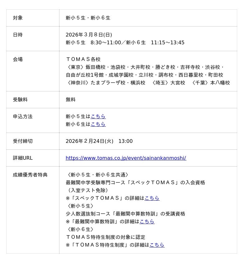 株式会社リソー教育グループ(本社:東京都豊島区、代表取締役:天坊真彦)の子会社である、株式会社TOMAS(本社:東京都豊島区、代表取締役:町田仁)は、2026年3月8日(日)に、新小5生と新小6生を対象とした模試「TOMAS最難関模試」を無料にて実施いたします。