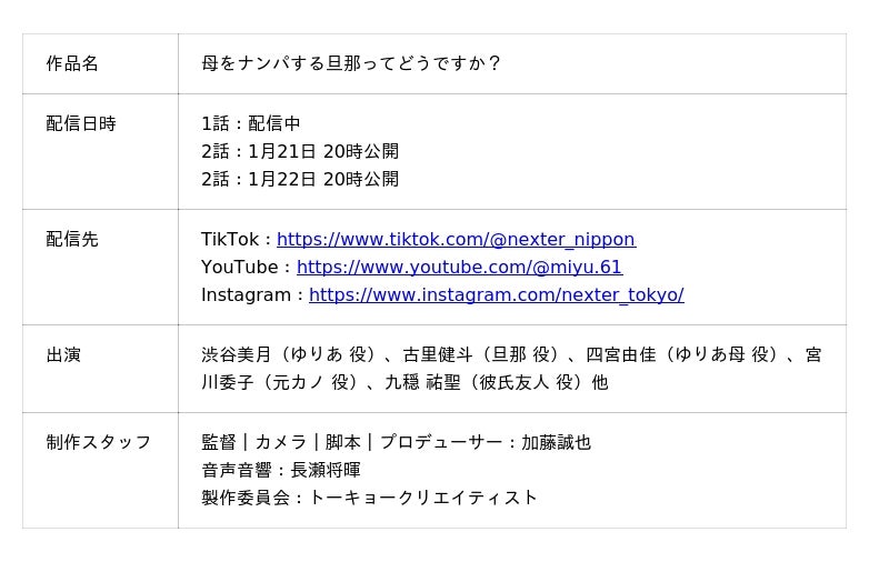 ネクスター株式会社(本社:東京都新宿区、代表取締役CEO:細田 悠巨)グループの「 TOKYO creatist 」は、実体験に基づく衝撃のエピソードを映像化したショートドラマ『母をナンパする旦那ってどうですか?』を公開開始。 本作は、SNSで募集した視聴者の実体験を元に構成された「実話ドラマ」です。