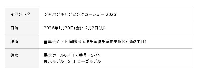 輸入車・自動車用品販売の株式会社ホワイトハウス(本社:愛知県名古屋市、代表取締役社長:木村 文夫)は、韓国の自動車メーカーHyundai(ヒョンデ)が開発した商用電気自動車「ST1(エスティ―ワン)」をジャパンキャンピングカーショー2026にて日本初紹介いたします。