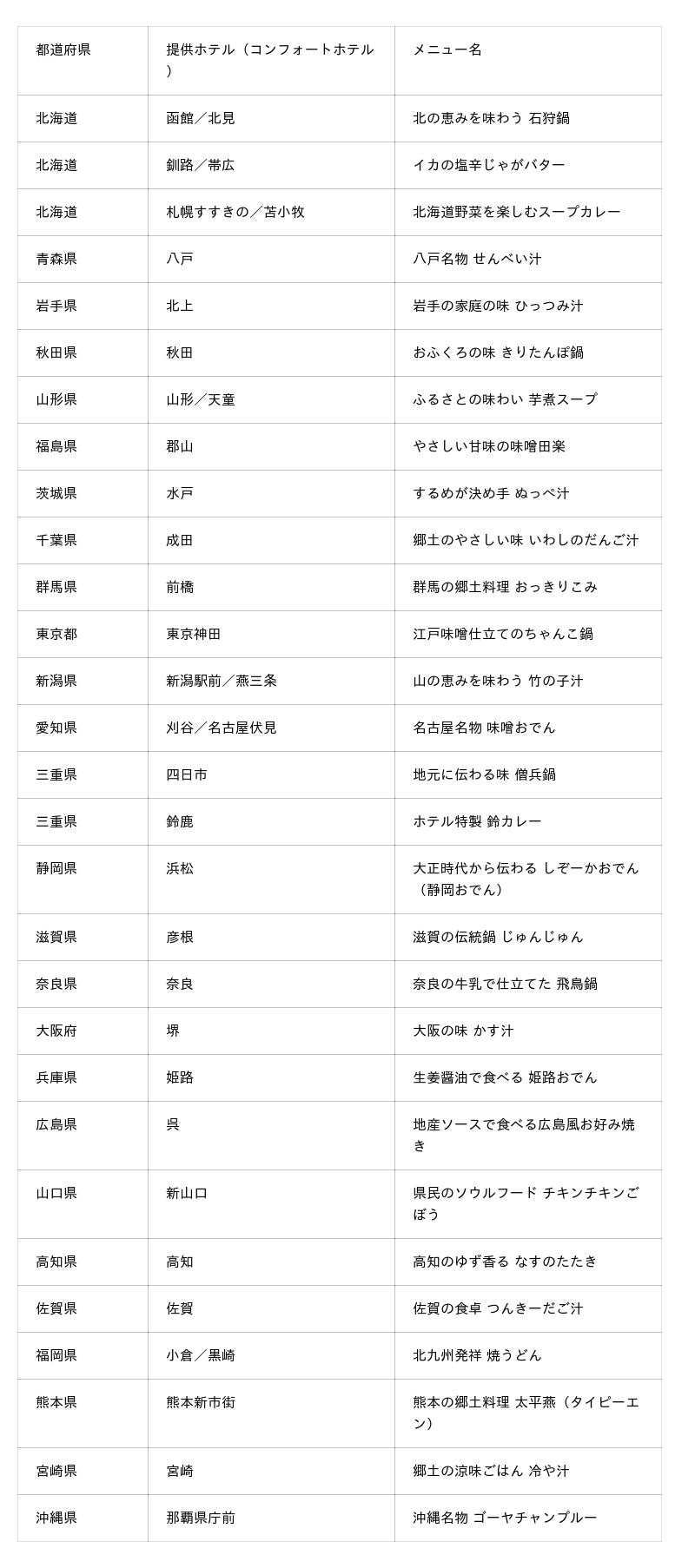 ※コンフォートホテル函館/北見、釧路/帯広、札幌すすきの/苫小牧、八戸、北上、山形/天童、水戸、成田、浜松、刈谷/名古屋伏見、四日市、佐賀、小倉/黒崎、宮崎は12月1日より提供開始