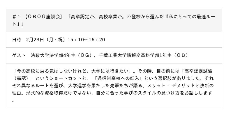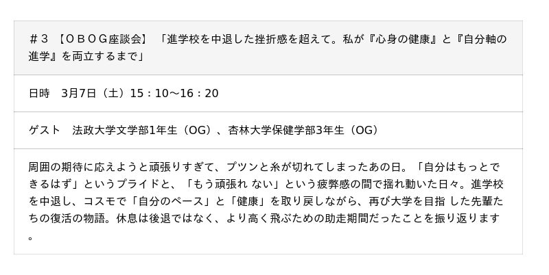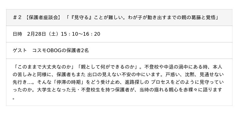 今回の公開講座では、不登校・中退から進路を切り開いた様々なケースを取り上げます。通信制高校や高卒認定、20代からの再スタートなど多様な経験をコスモのOB OGが語り、現在、不安のさなかにある皆様に将来への手がかりとしていただきます。 さらに初の試みとして保護者座談会を2回実施。「出口の見えない」不安の中で揺れる親心や再スタート後の親子の関係性、自立に向け「手を放す」勇気など、同じ悩みをもつご家庭の参考になれば、とコスモOBOGの保護者様のご協力をいただき、 「親視点」のリアルな声をお届けします。