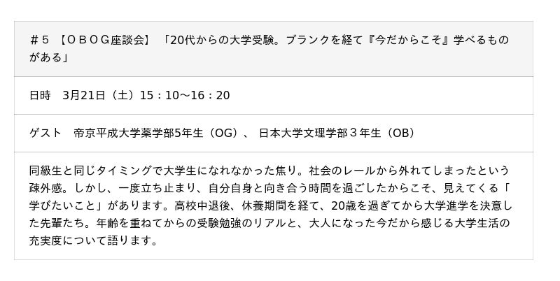 不登校・中退の当事者に話を聞く機会は数少なく、本講座は「あの時、何を感じていたか」「どうやって一歩を踏み出したか」など、本人の声を聴く貴重な機会です。ハイブリッド開催のため、全国から参加いただけます。 この機会を貴媒体でご紹介いただくとともに、ぜひご取材いただき、記事づくりの参考としてお役立てください。