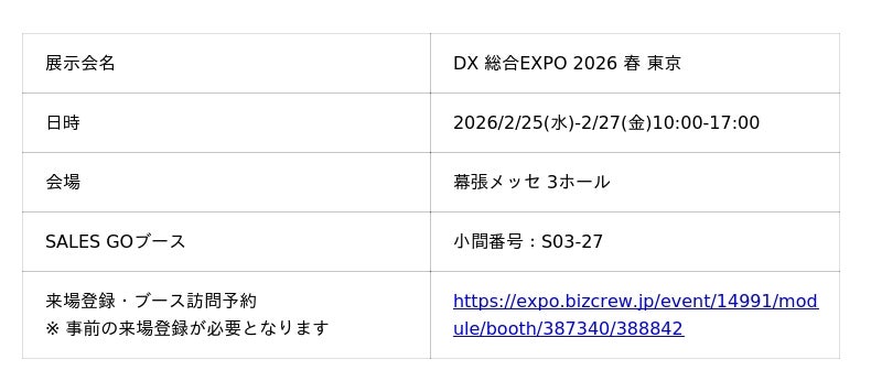 純国産SFAを活用した営業DX/AXサービスを提供するSALES GO株式会社(セールスゴー、所在地:東京都中央区、代表取締役社長:内山 雄輝)は、2026年2月25日(水)~27日(金)、幕張メッセで開催される「DX 総合EXPO」に出展いたします。