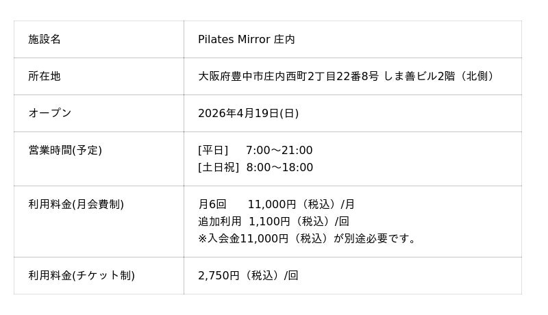 コナミスポーツ株式会社(以下、「弊社」)は、2026年4月に、天井にミラーを設置したマシンピラティススタジオ「Pilates Mirror」を大阪府茨木市・大阪府豊中市・千葉県船橋市・神奈川県川崎市に4店舗オープンします。また、今回初めて千葉県内に出店します。