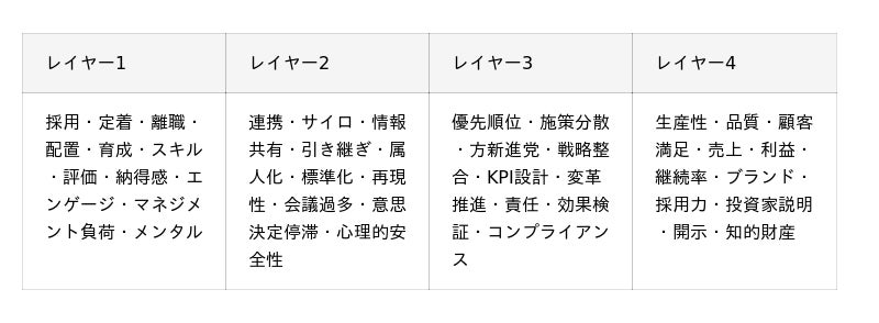 【示唆】 人的資本経営の議論は“戦略(レイヤー3)”に寄せて語られがちですが、現場では「組織の運用(レイヤー2)」と「価値創出・開示(レイヤー4)」の設計が置き去りになりやすい可能性があります。4レイヤーで抜けを可視化し、施策の優先順位と運用設計に接続することが、導入・定着の近道になり得ます。
