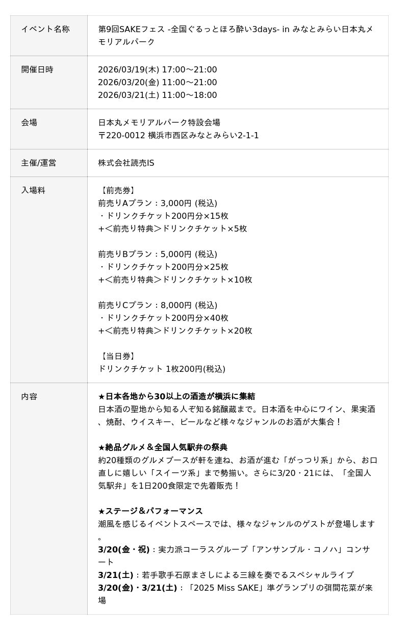 株式会社穴太ホールディングス(本社:千葉県木更津市、代表取締役:戸波亮)が経営する株式会社宮崎酒造店(千葉県君津市戸崎1780番地)(以下当社)は、2026年3月19日(木)から21日(土)の3日間、横浜・みなとみらいで開催される『第9回SAKEフェス -全国ぐるっとほろ酔い3days-』に初出店します。