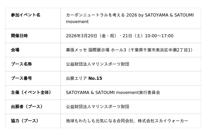 公益財団法人マリンスポーツ財団(以下、Maris)は、2026年3月20日(金・祝)・21日(土)に幕張メッセ国際展示場ホール3で開催される環境イベント「カーボンニュートラルを考える 2026 by SATOYAMA&SATOUMI movement」に出展ブースとして参加します。Marisブースでは「SDGs Village ~未来の海を、今日から守ろう!~」と題した海洋環境保全プログラムを展開。参加型の付箋プロジェクト・パネル展示などを2日間にわたって実施します。