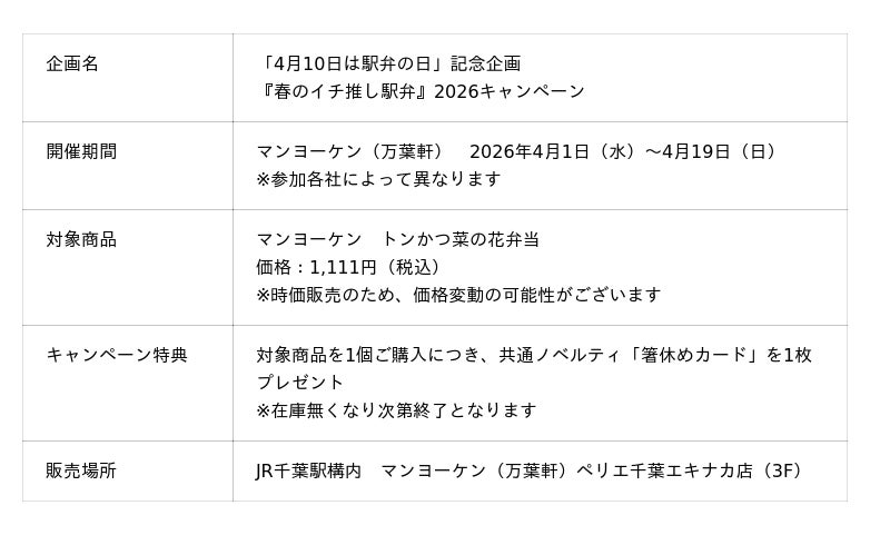 リエイグループの株式会社リエイライフ(本社:千葉県浦安市、代表取締役社長:椛澤 大樹)が展開する千葉県の老舗駅弁ブランド「マンヨーケン(万葉軒)」は、2026年4月1日(水)から4月19日(日)までの期間、一般社団法人 日本鉄道構内営業中央会が主催する「『春のイチ推し駅弁』2026キャンペーン」に参加いたします。