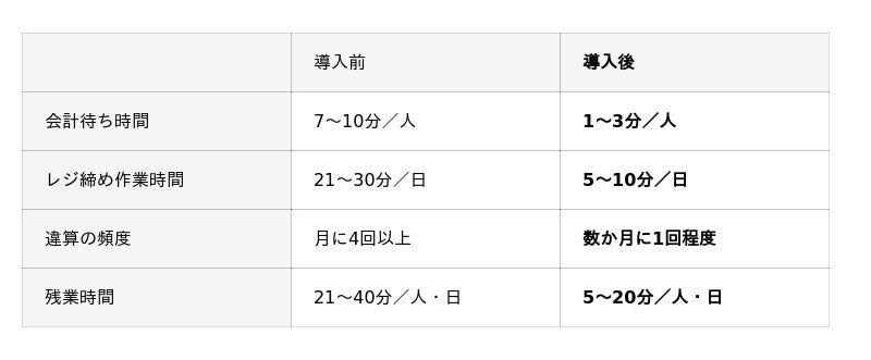 導入後、数値としての変化は明確でした。会計待ち時間:7~10分 → 1~3分