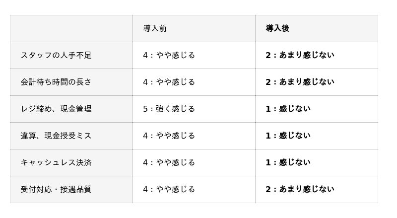 現金の授受や釣銭確認など金銭トラブルリスクに伴う緊張感がなくなり、スタッフの精神的負担が大きく軽減されました。