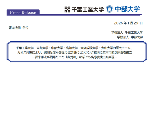 千葉工業大学・東邦大学・中部大学・高知大学・大阪成蹊大学・大和大学の研究チーム、カオス共鳴により、微弱な信号を捉える次世代センシング技術に応用可能な原理を確立
