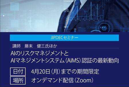 一般財団法人日本情報経済社会推進協会(以下JIPDEC)は、2026年4月20 日まで、JIPDECセミナー「AIのリスクマネジメントとAIマネジメントシステム(AIMS)認証の最新動向」をオンデマンド配信いたします。